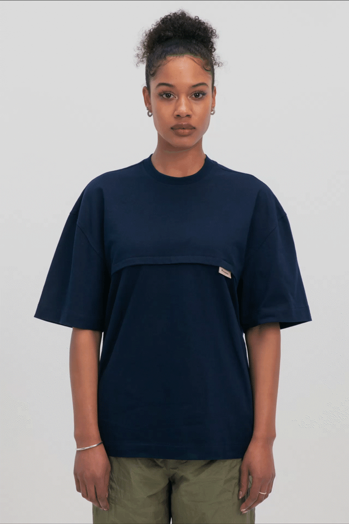 Sie trägt unser T-Shirt mit Passe (Blau) in Größe S.